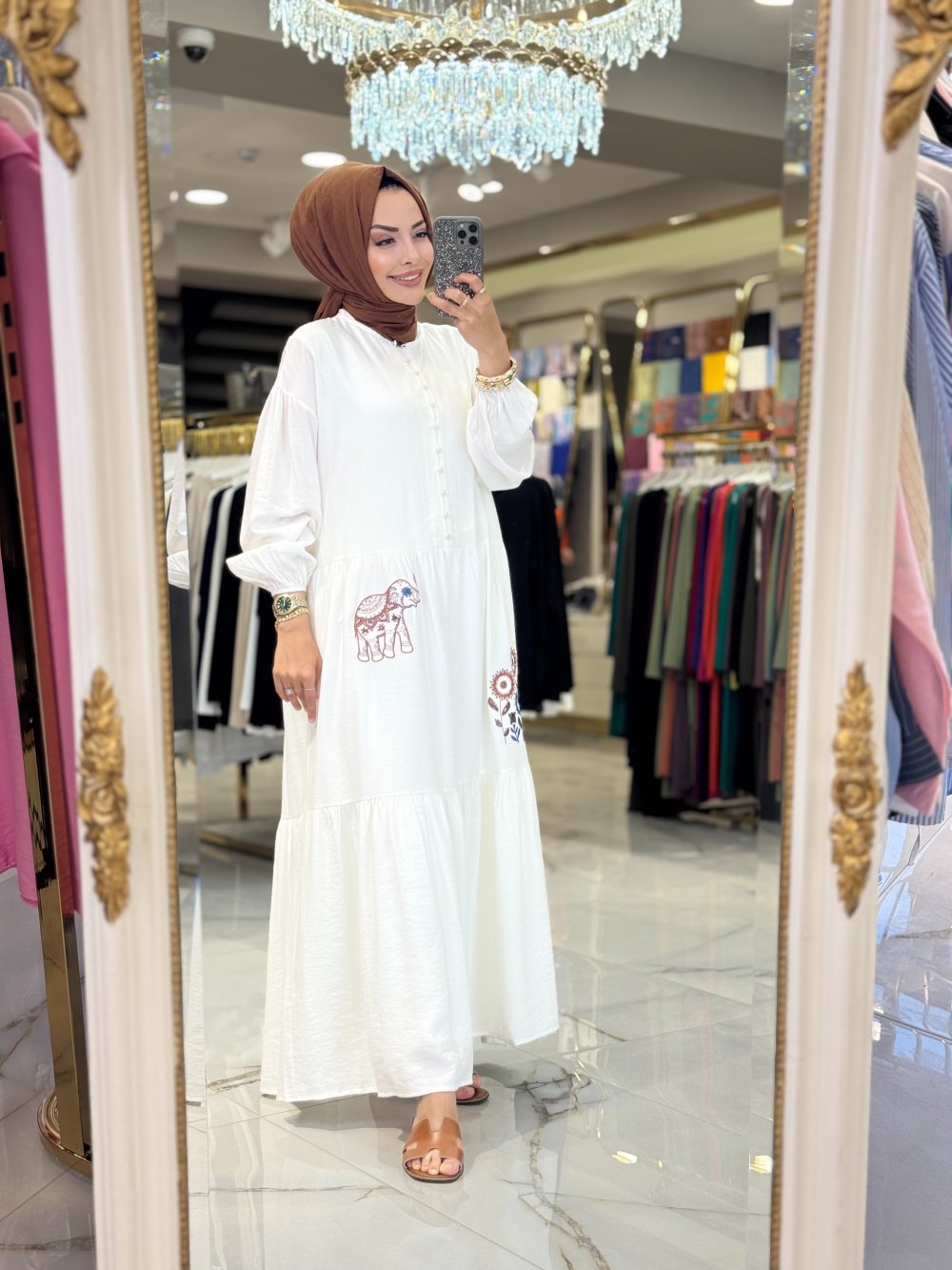 33123 Etnik Sim Nakışlı Elbise Ekru