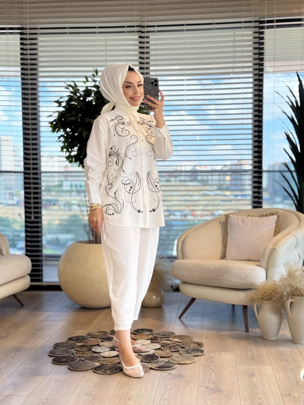 33962 Önü Boncuk Ve Taş İşlemeli Gömlek Ekru