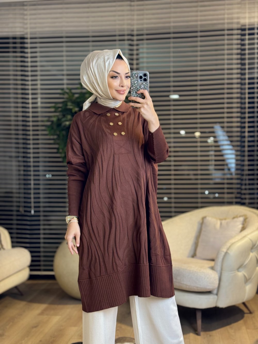3502 Kendinden Desenli Patı 2 Sıra Düğmeli Triko Tunik Kahve