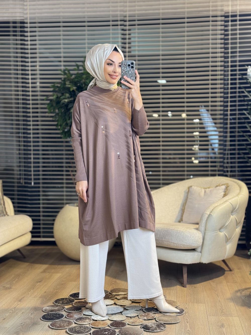 3508 Üst Pul Nakışlı Kendinden Desenli Triko Tunik Vizon