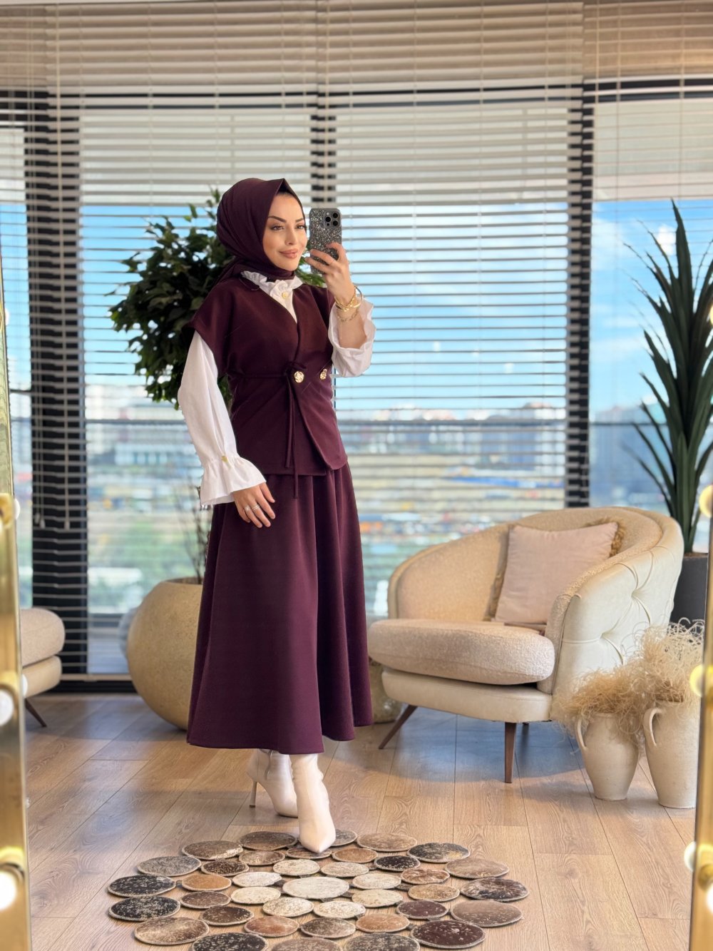 35718 Kruvaze Yelekli Etekli Takım Bordo