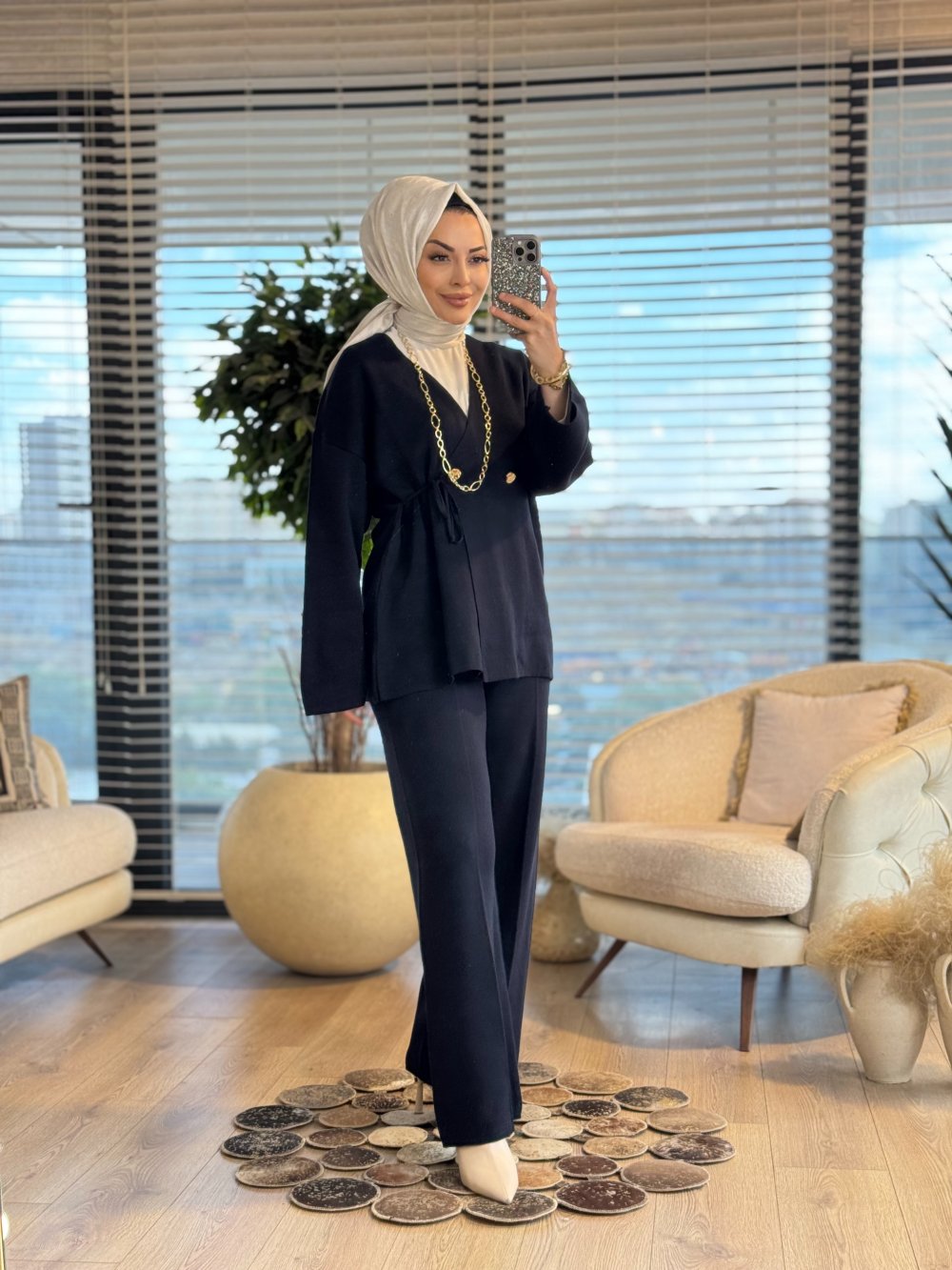 35881 Kruvaze Düğmeli Triko Pantolonlu Takım Lacivert