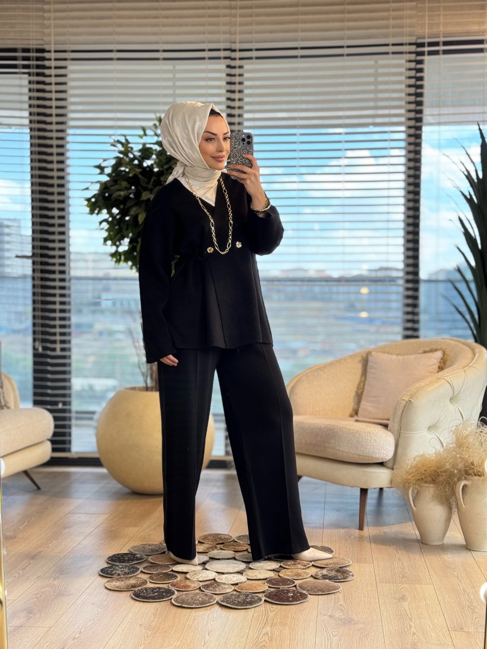 35881 Kruvaze Düğmeli Triko Pantolonlu Takım Siyah
