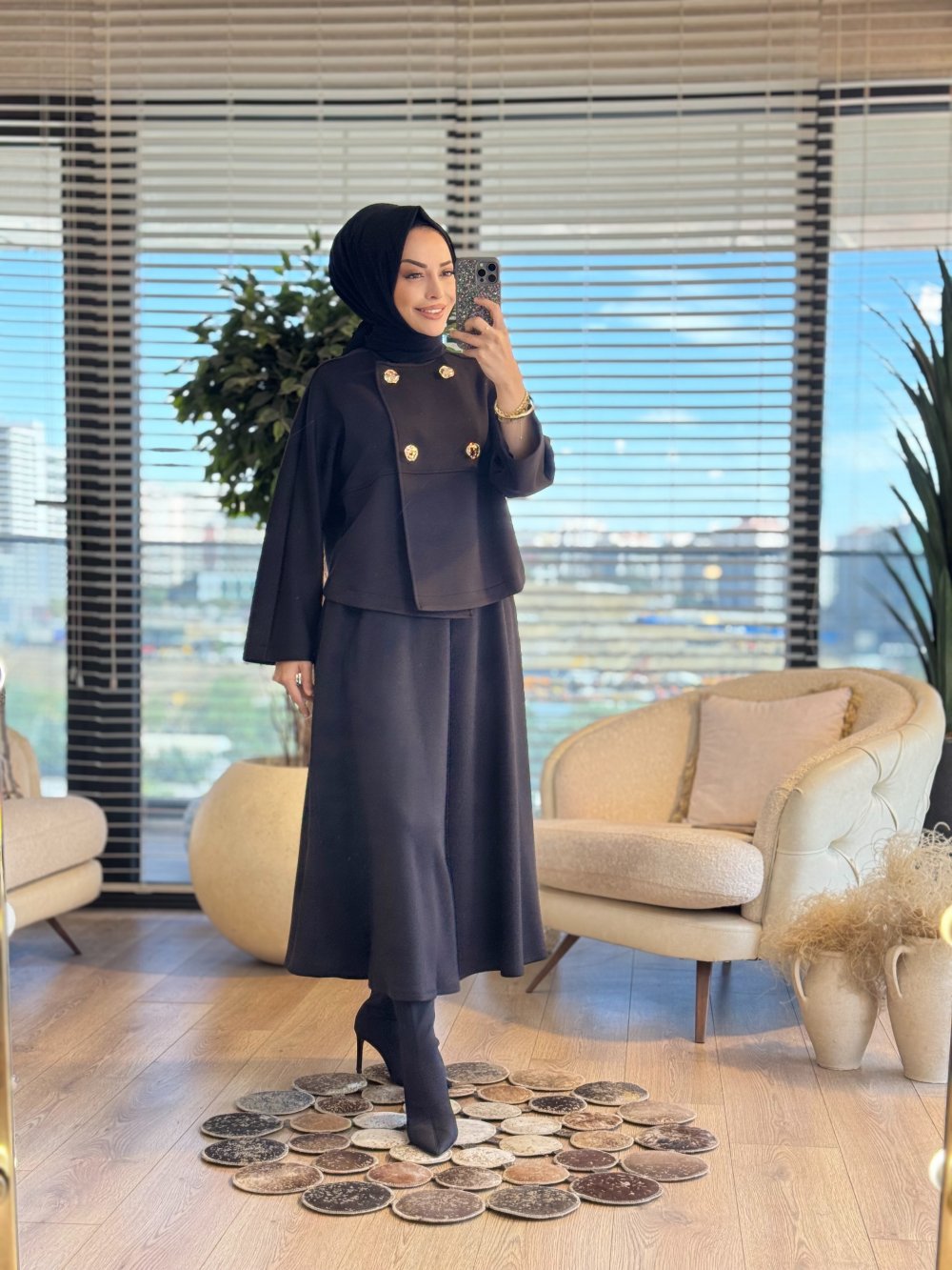 35946 Yarasa Kollu Gold Düğmeli Etekli Takım Siyah