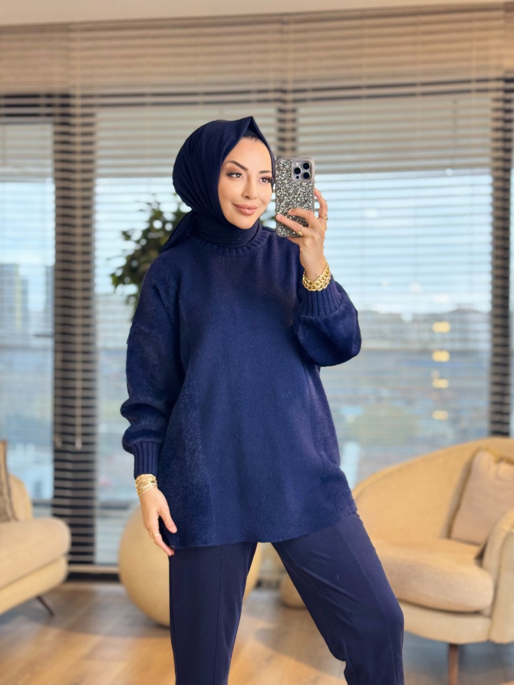 44101 Yanları Ve Kolu Saçak Triko Tunik Lacivert