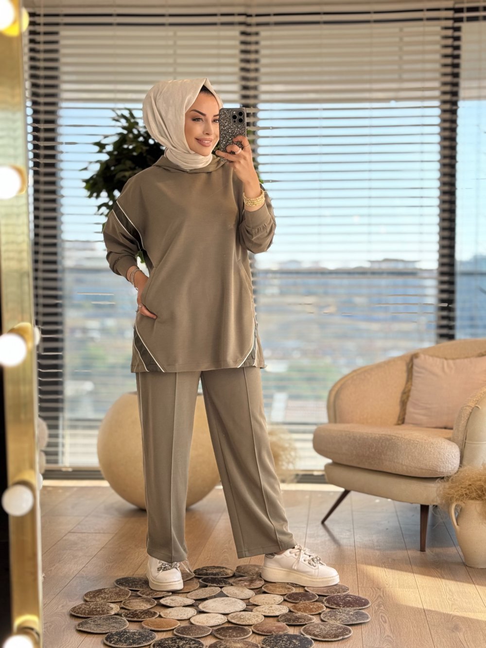4419 Kolları Sim Şerit Detaylı Takım Haki