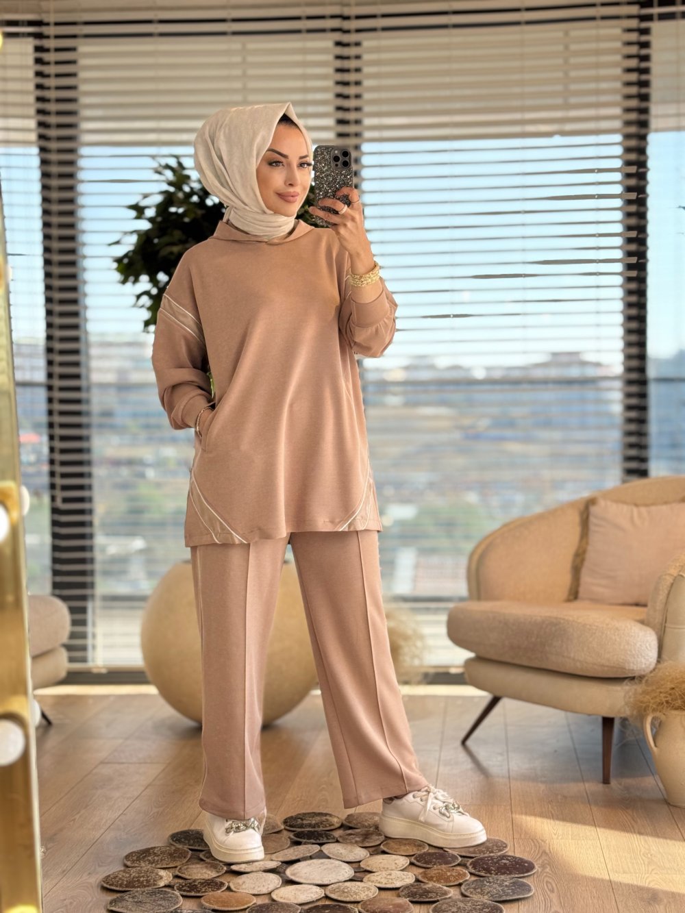 4419 Kolları Sim Şerit Detaylı Takım Vizon