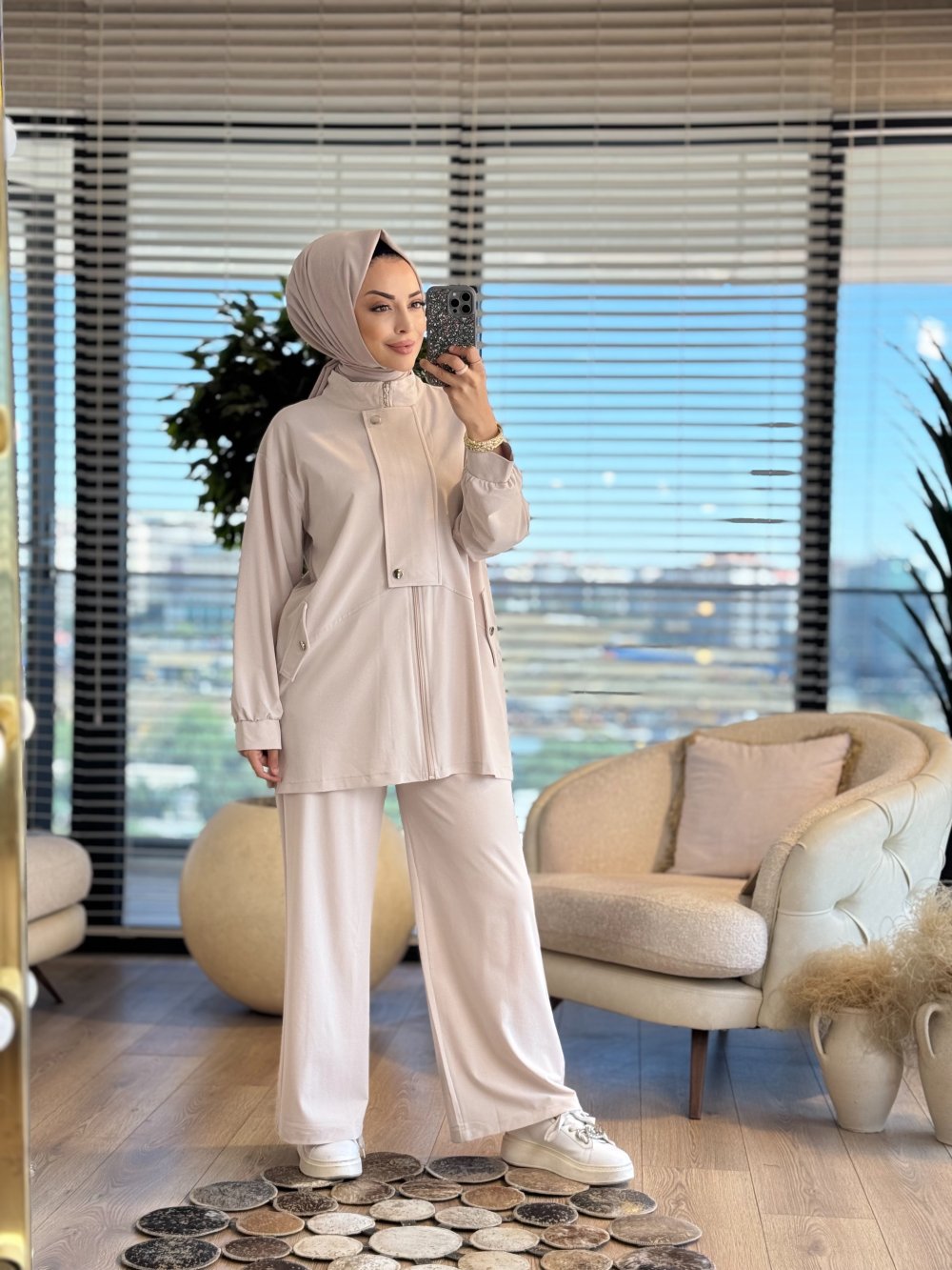 4420 Tencel Patı Çıtçıt Ve Cep Detaylı Takım Bej