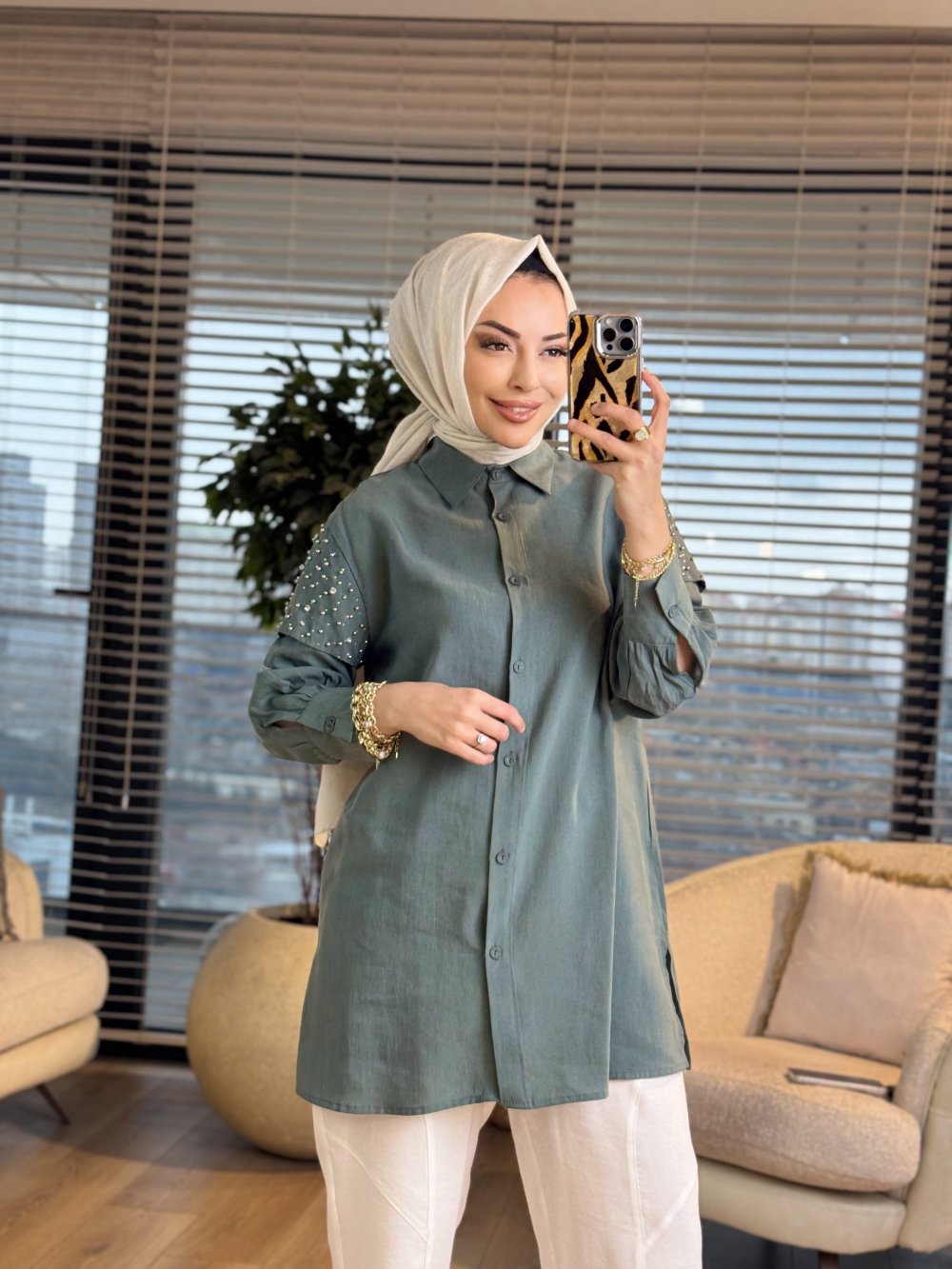 4442 Omuzları Taş ve Boncuk Detaylı Tunik Çağla