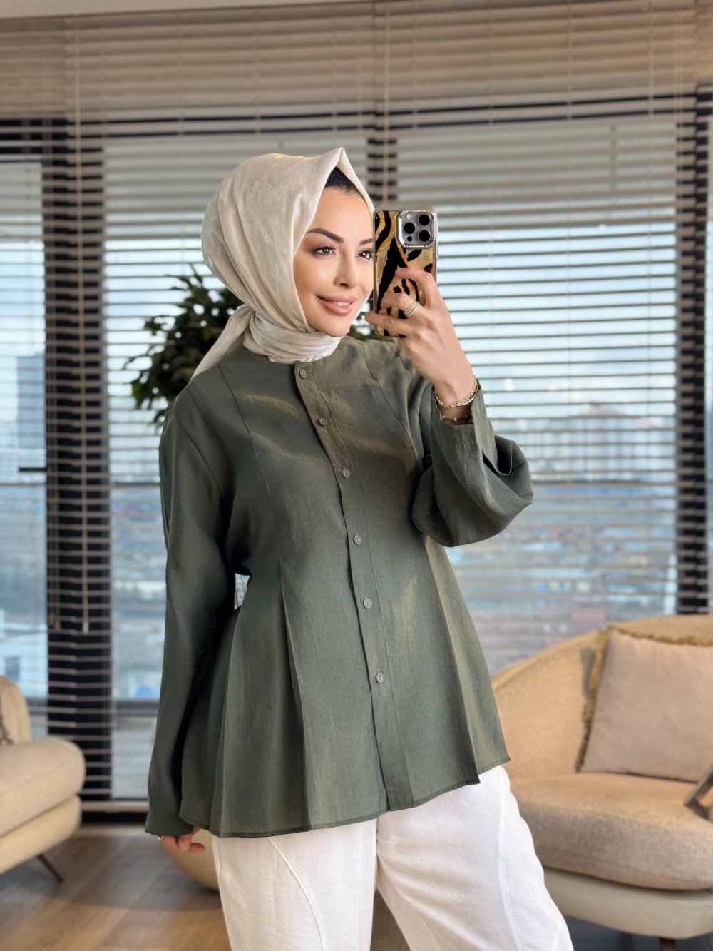 4474 Ön Dikiş Detaylı Yakasız Gömlek Haki