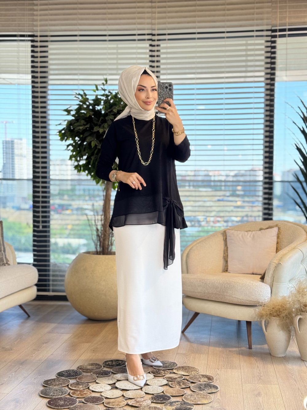 457 Alt Şifonlu Fiyonklu Tunik Siyah
