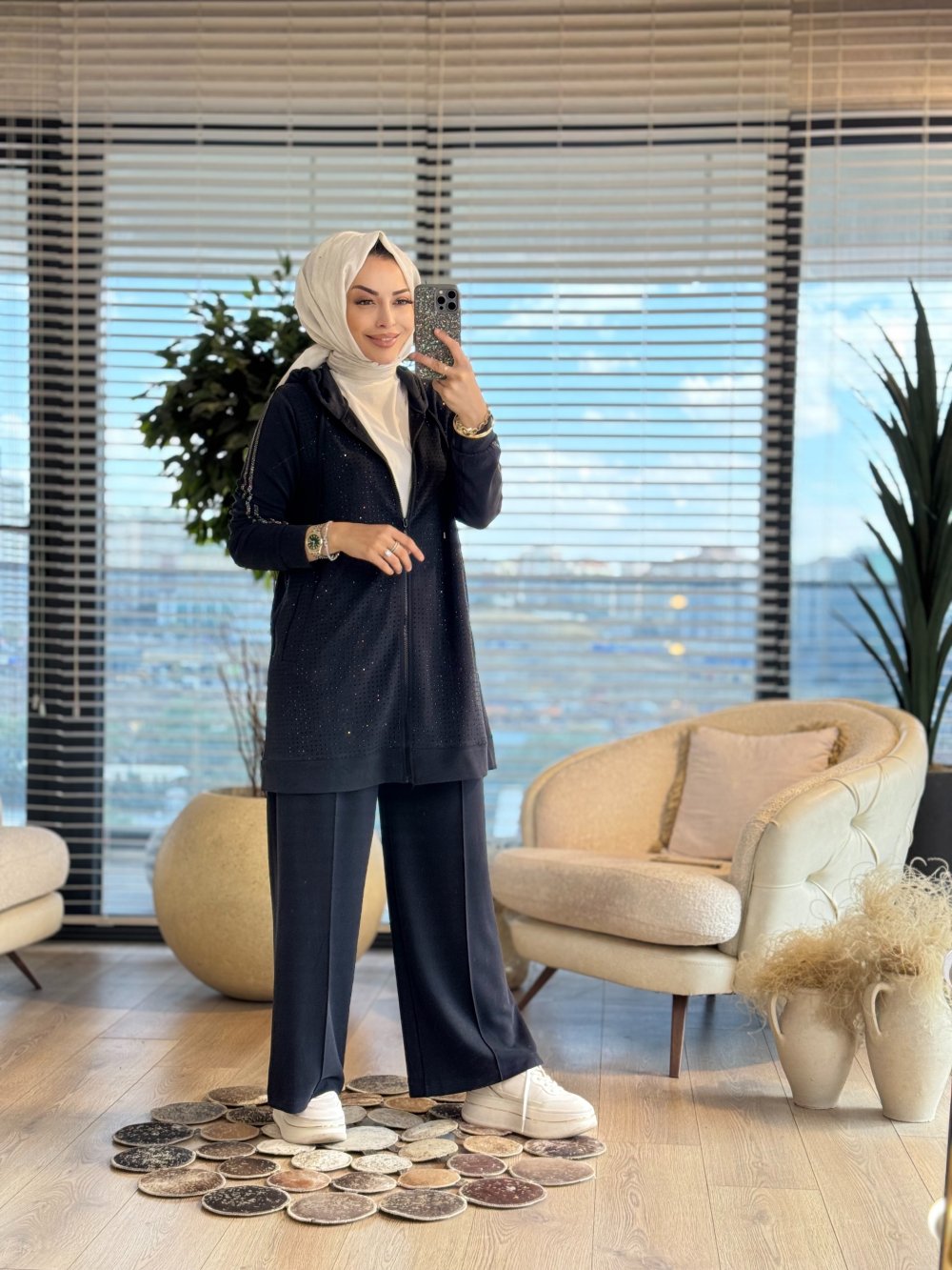 4598 Ön Kol Serpme Taş Baskılı Fermuarlı Takım Siyah