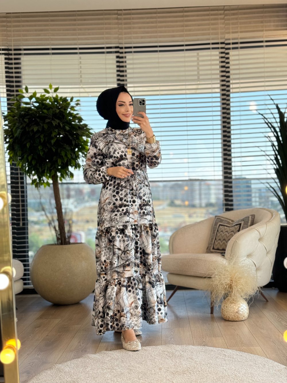 5002 Puan Ve Karışık Çizgi Desen Elbise Siyah
