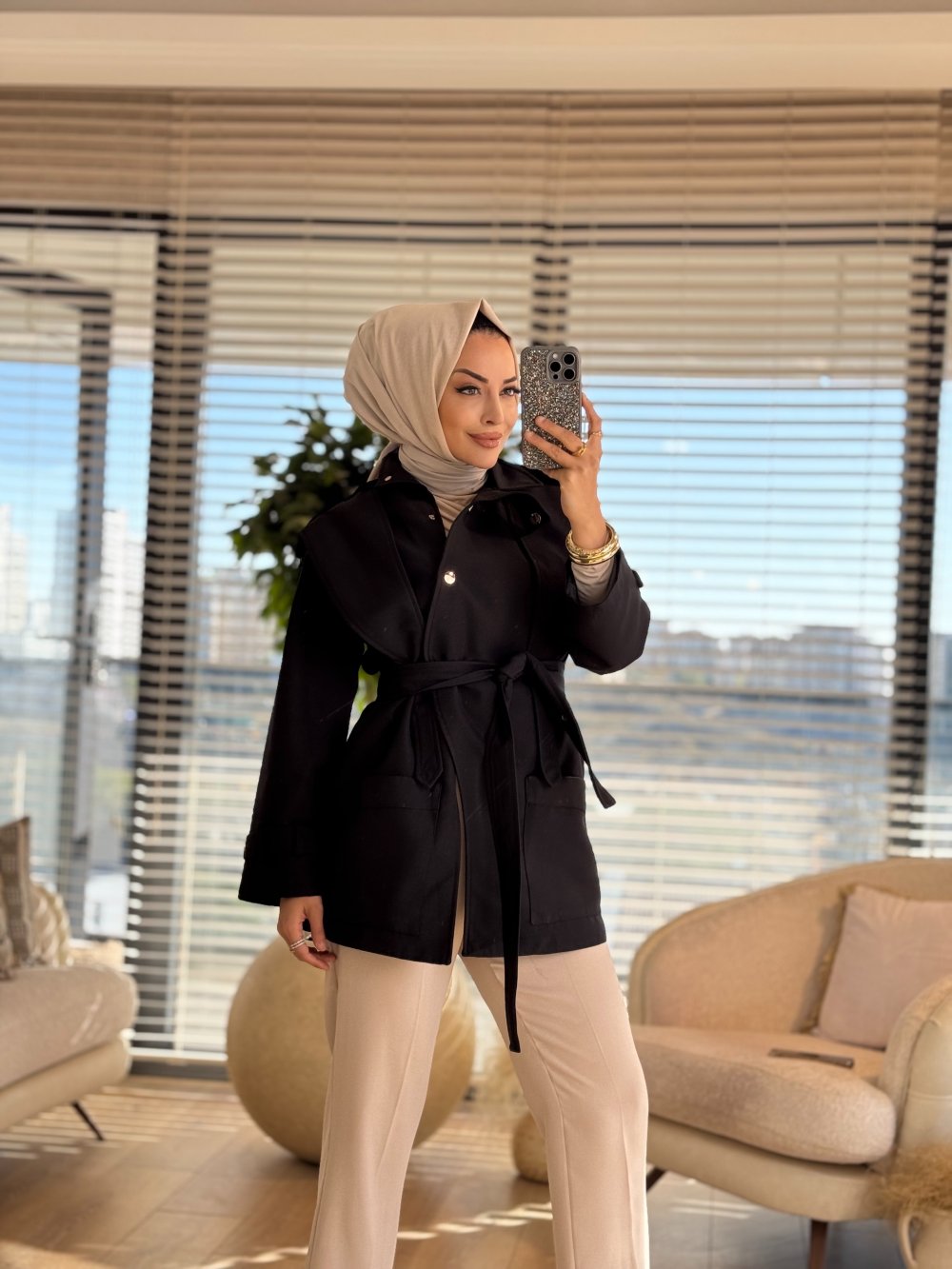 51198 Ön Oval Parça Apoletli Kısa Trenç Siyah