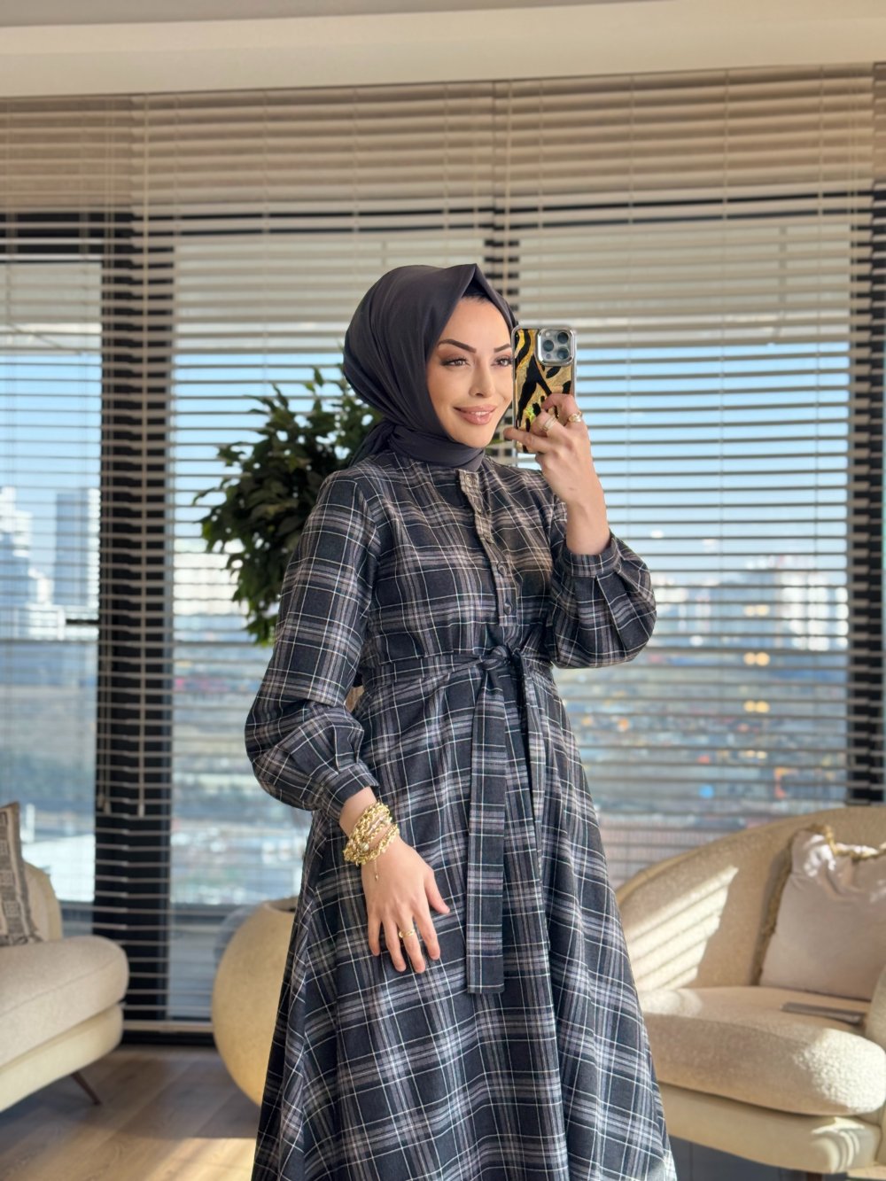 51272 Ekose Patı Düğmeli Elbise Siyah