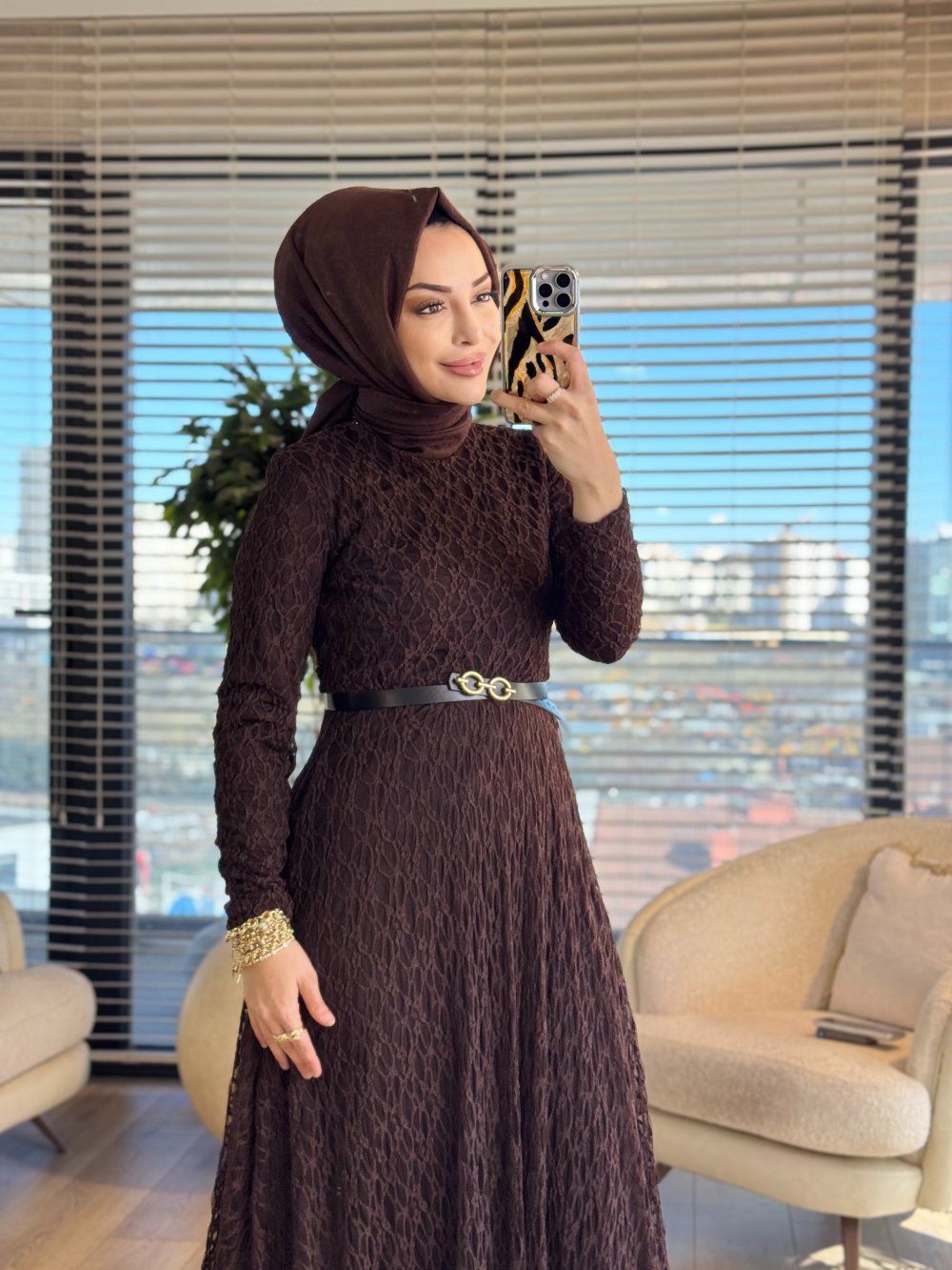5280 Dantel Kemerli Elbise Kahve