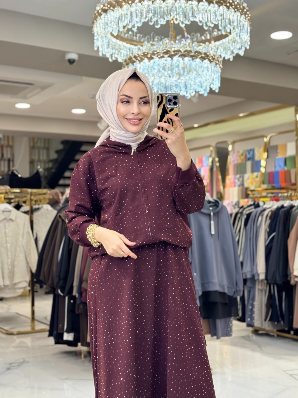 52826 Taş Baskılı Kapşonlu Fermuarlı Etekli Takım Bordo