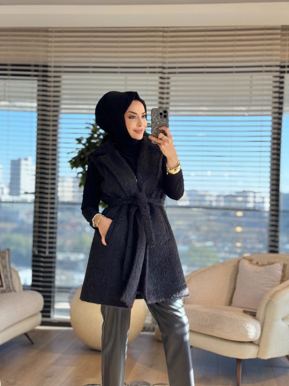 70082 Saçak Yakalı Uzun Yelek Siyah