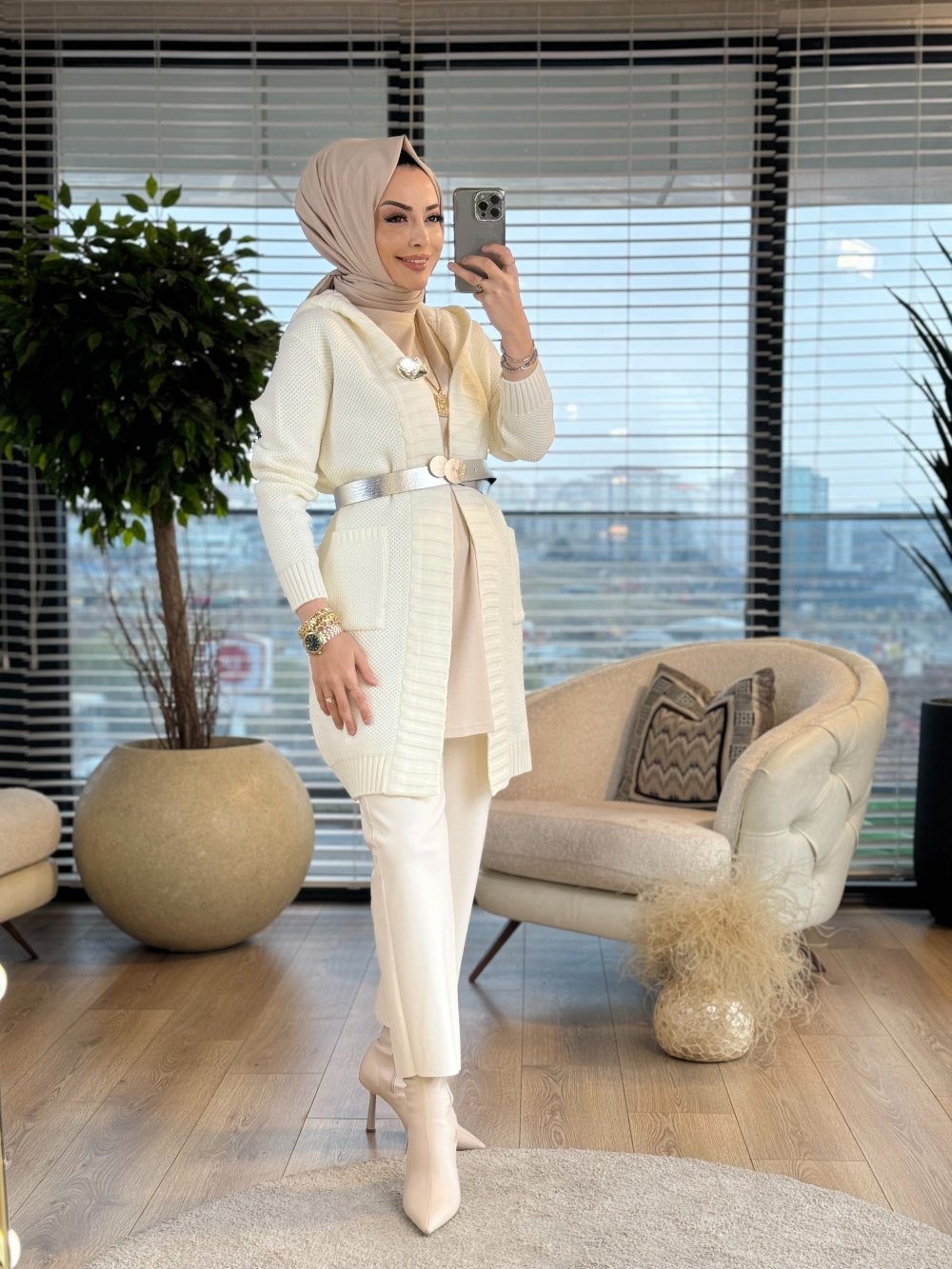 7029 Pirinç Örgü Kapşonlu Hırka Ekru