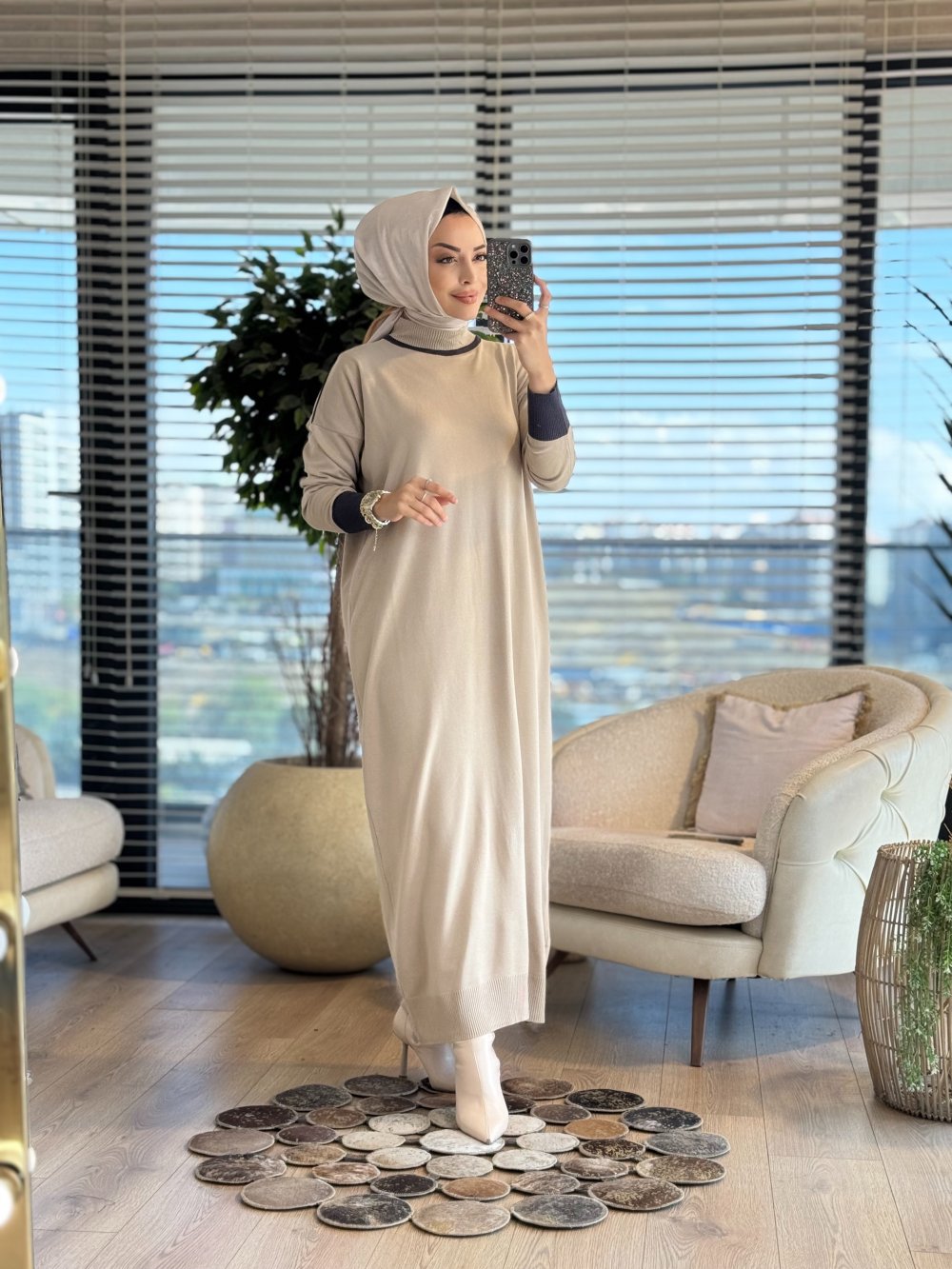 7032 Omuzu Manşetli Garnili Triko Elbise Bej