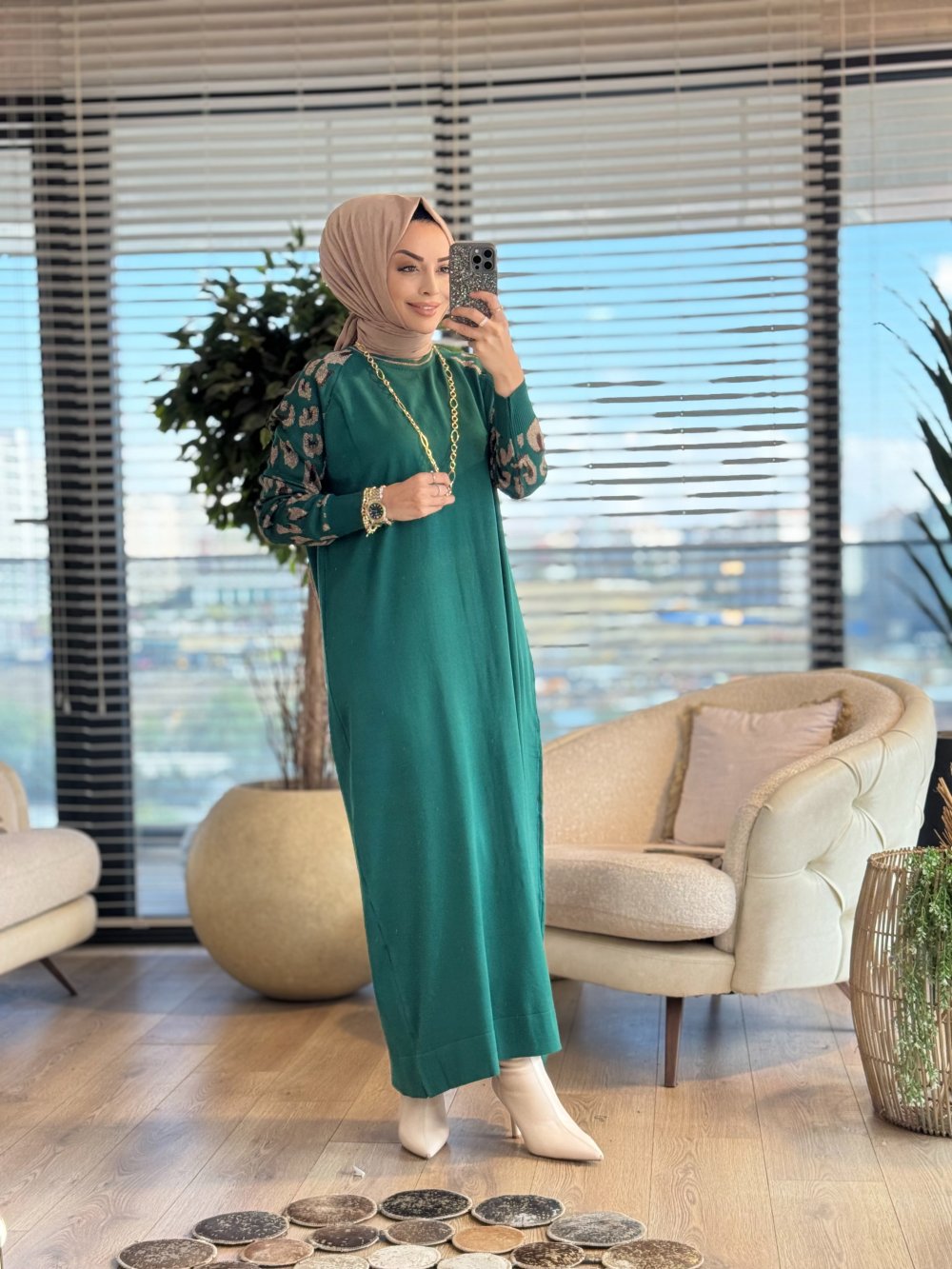7050 Kolları Leoparlı Vanezia Elbise Zümrüt