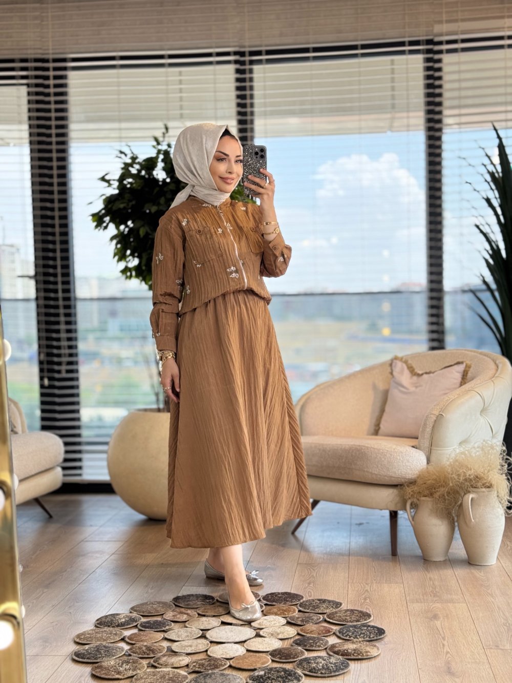 71079 Üstü Çiçek Nakışlı Etekli Takım Camel
