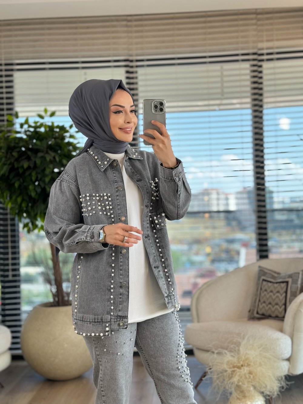 7201 Önü İnci İşli Kot Ceket Antrasit