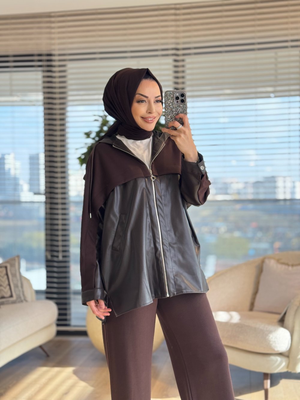 72093 Önü Ve Kapşonu Deri Detaylı Takım Kahve