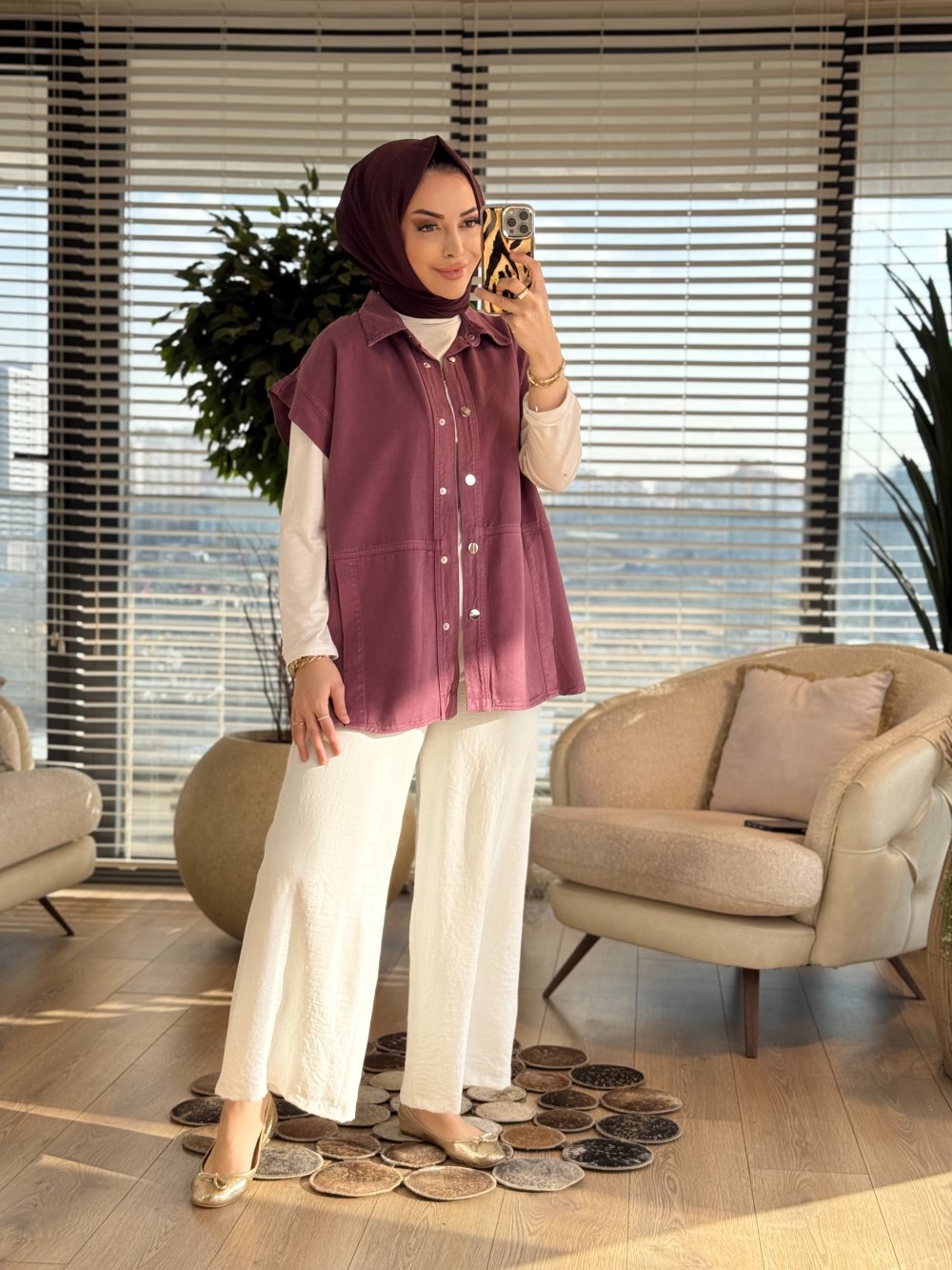 7441 Tencel Ön Dikişli Ve Cepli Yelek Mürdüm