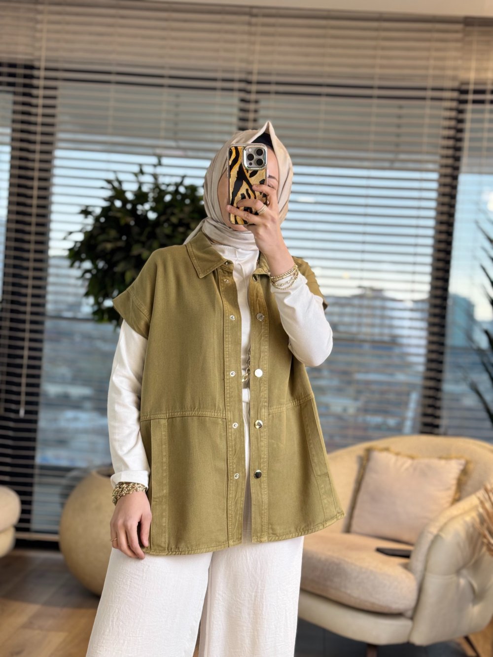 7441 Tencel Ön Dikişli Ve Cepli Yelek Yağ Yeşili