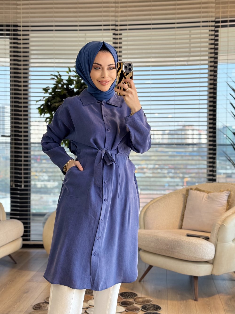 7501 Ön Düğmeli Kuşaklı Uzun Tunik İndigo