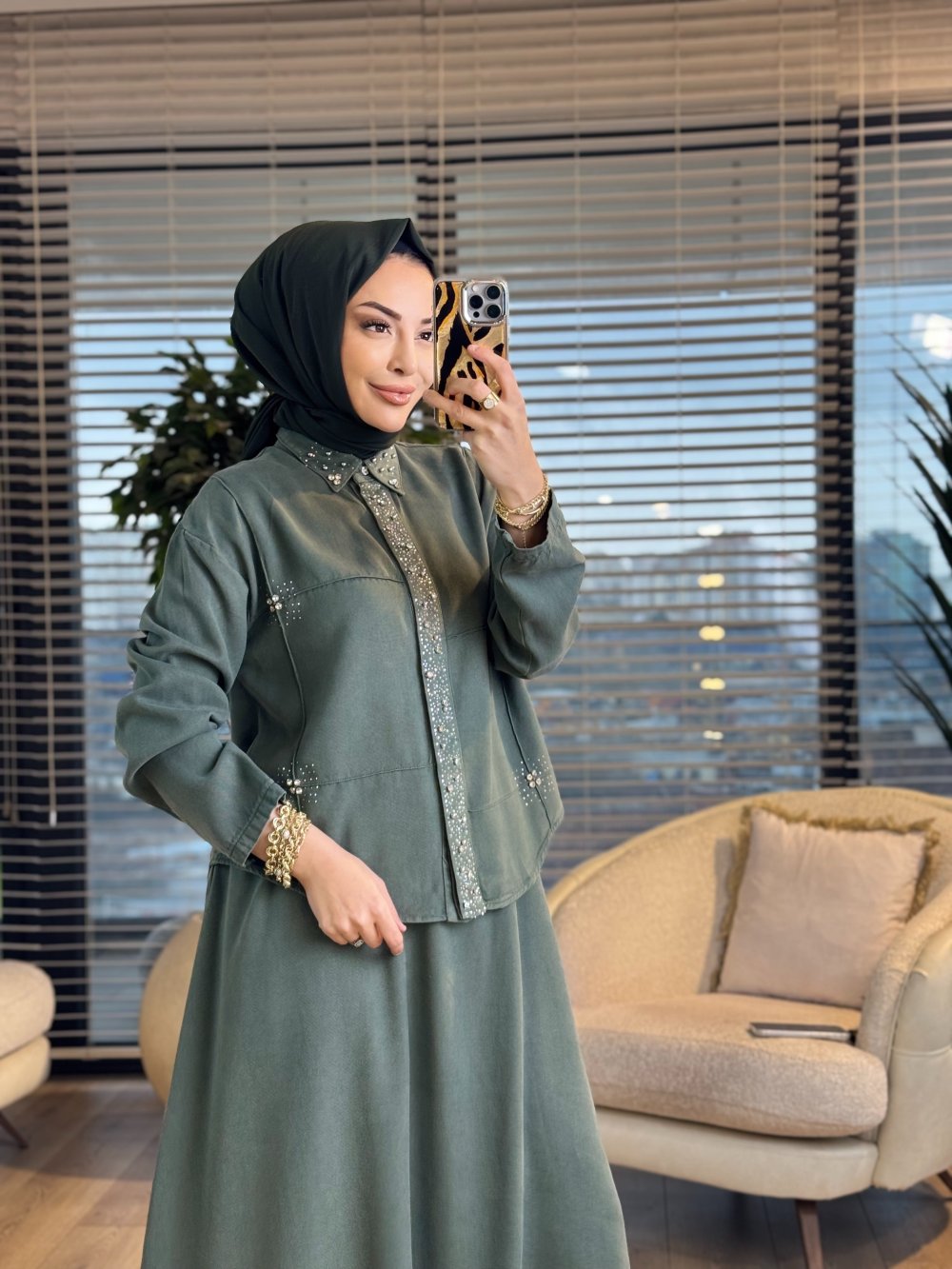 7502 Patı Yakası Taşlı Kot Etekli Takım Haki