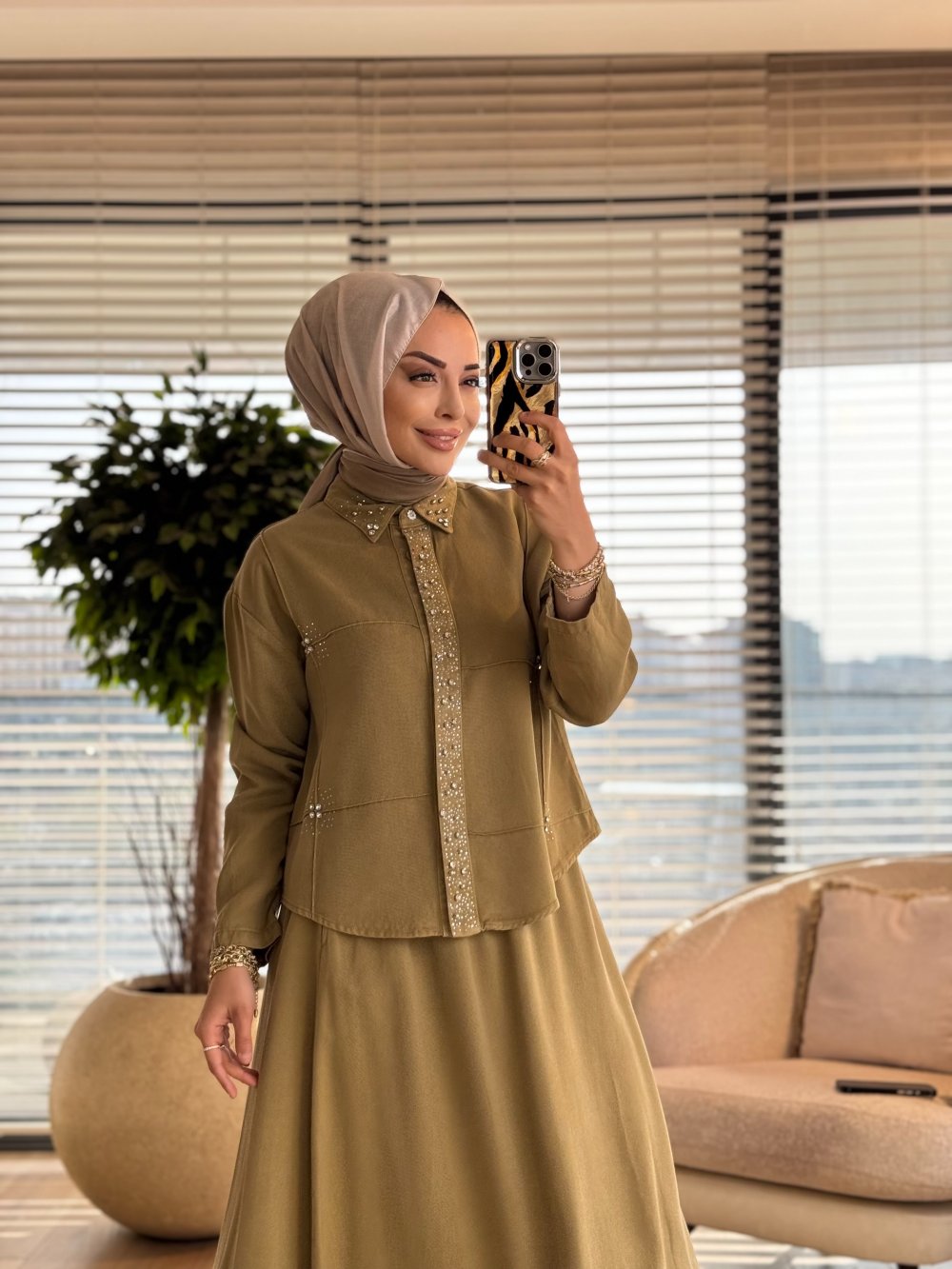 7502 Patı Yakası Taşlı Kot Etekli Takım YağYeşili
