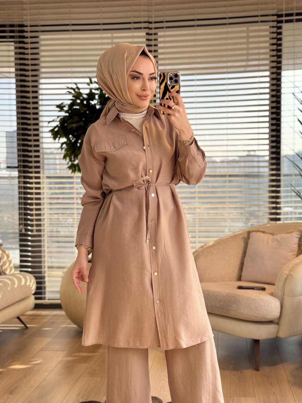 7513 Uzun Tunik Tek Cepli Takım Bej
