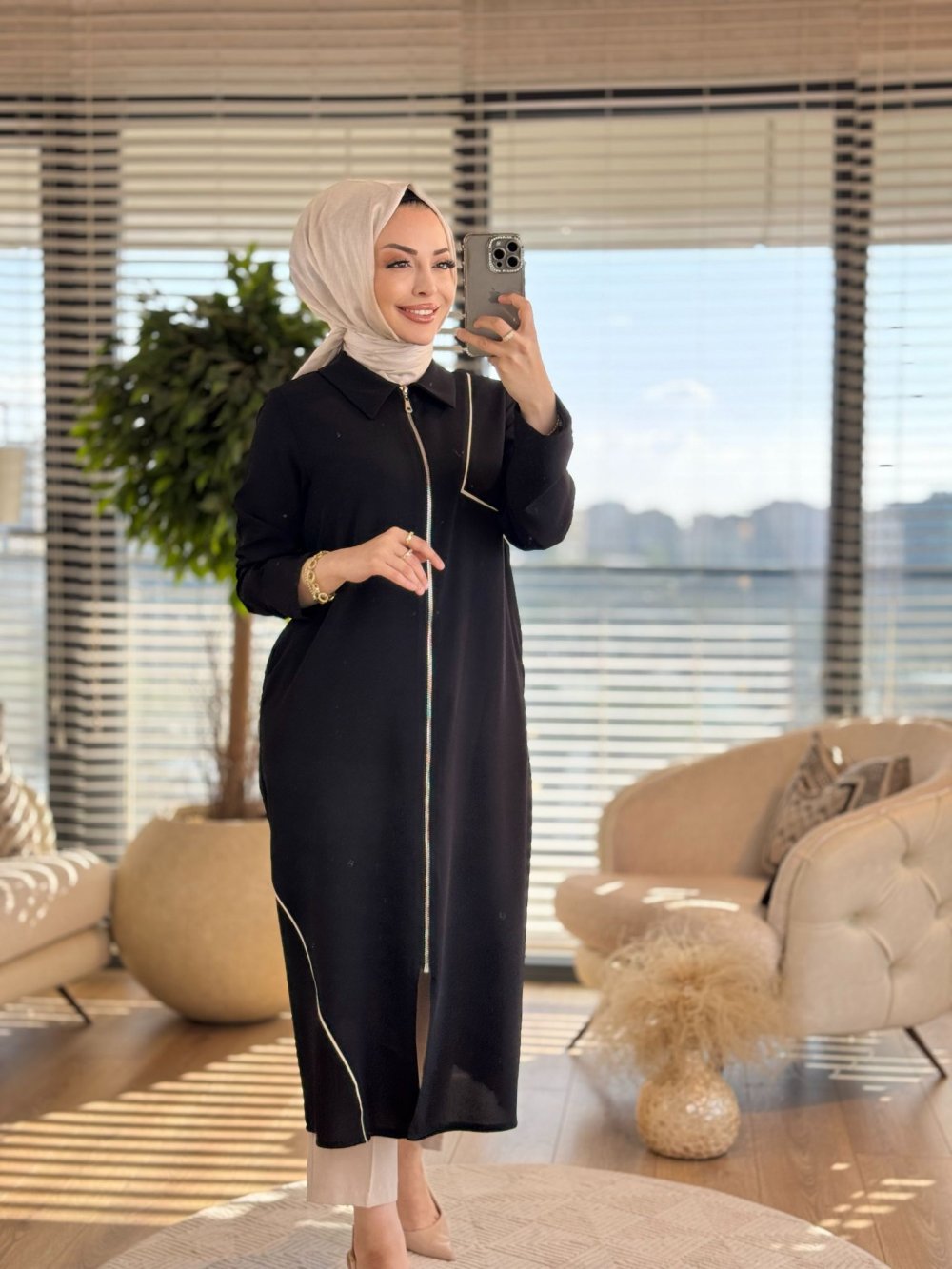 7644 Sağ Omuz Etek Ucu Biyeli Fermuarlı Kap Siyah