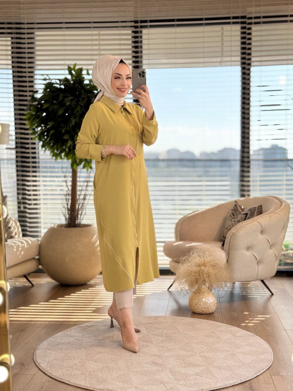7644 Sağ Omuz Etek Ucu Biyeli Fermuarlı Kap Yağ Yeşili