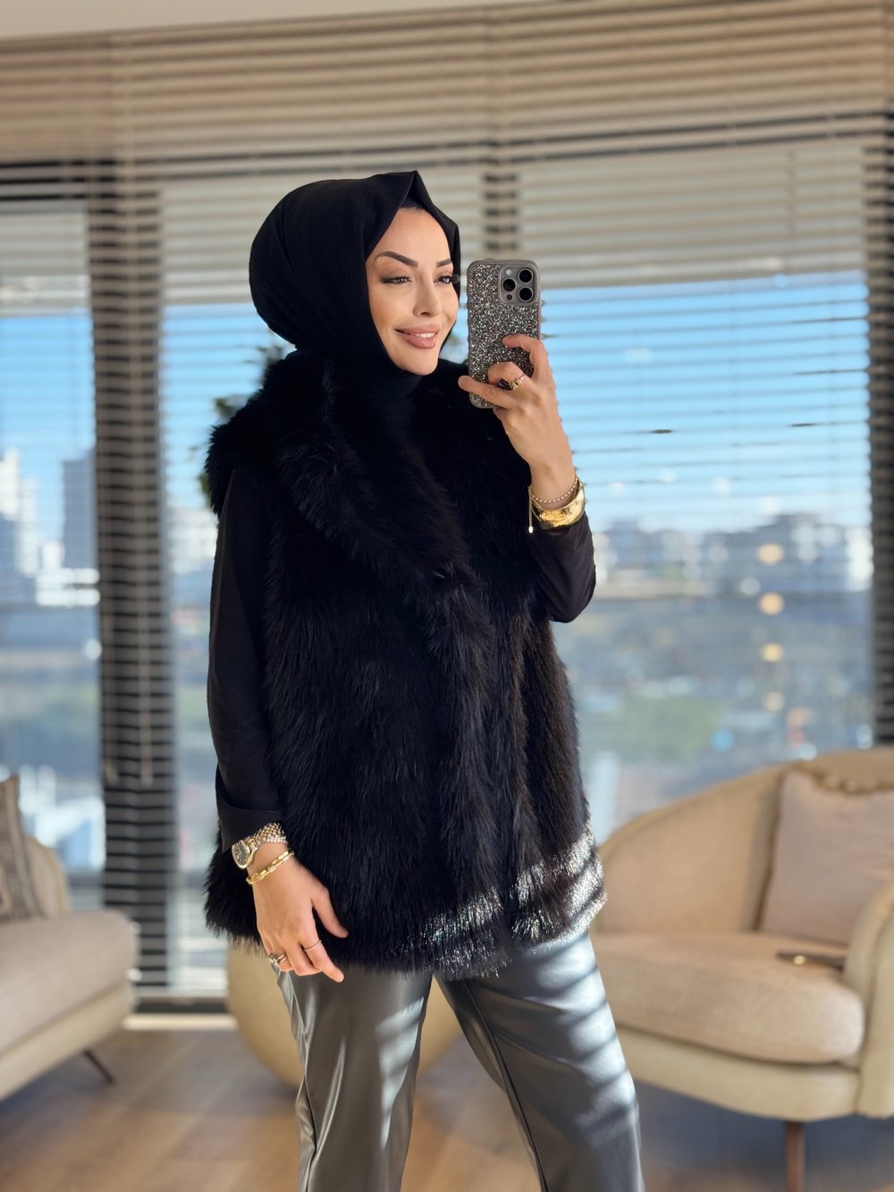 7921 Peluş Yakalı Düğmesiz Yelek Siyah