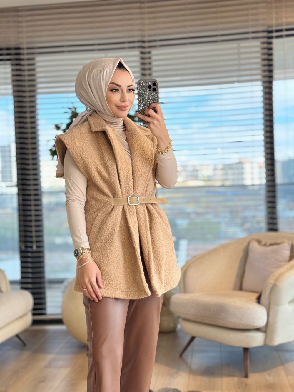 7979 Bukle Kemer Detaylı Yelek Vizon