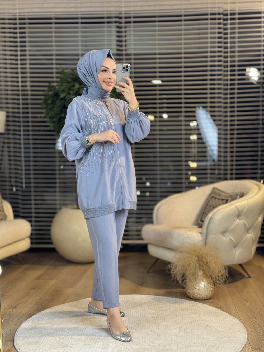 8510 Sol Taraf Boyuna Taş Baskılı Takım İndigo