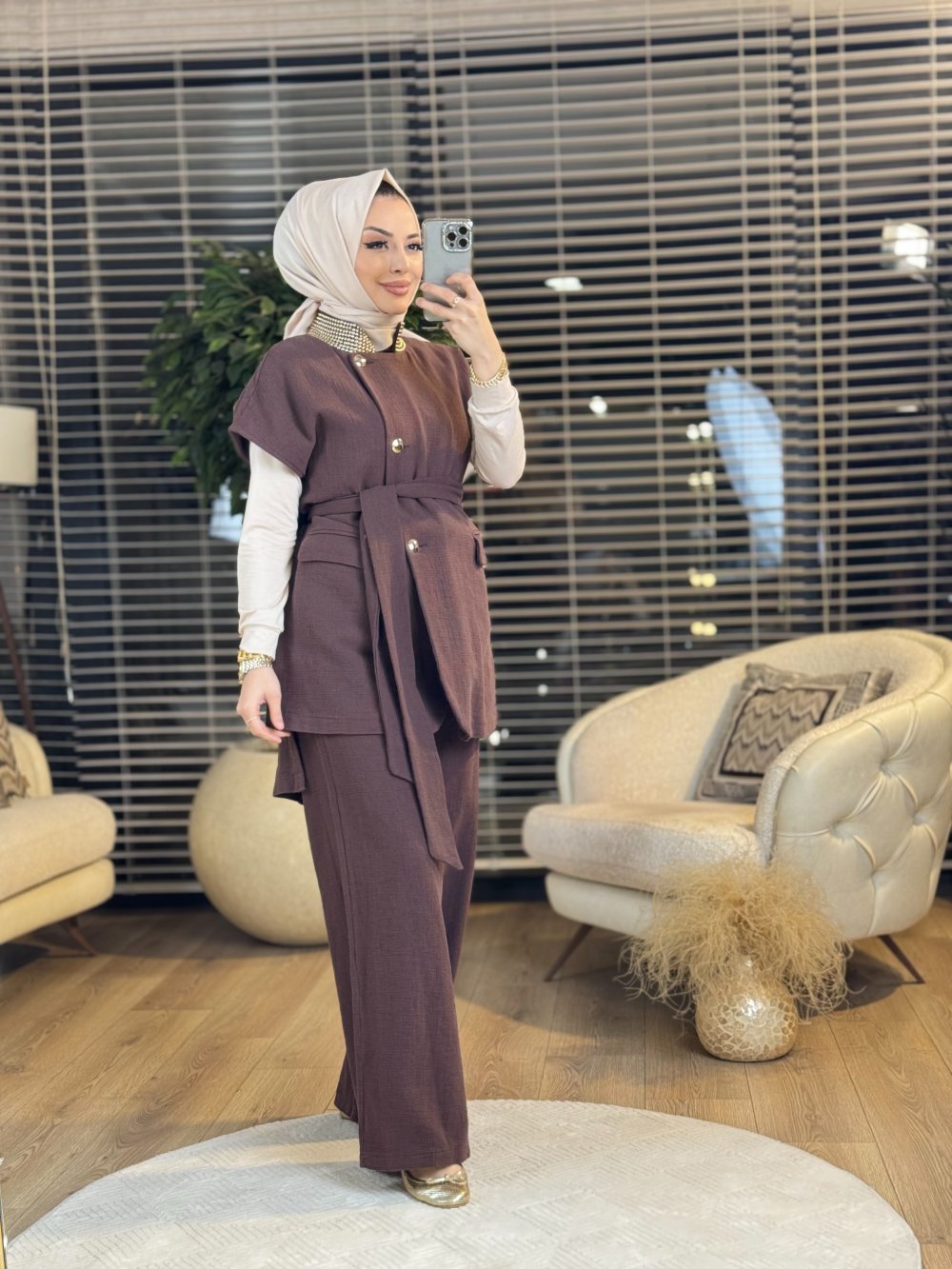 8511 Yaka Zımbalı Yelekli Takım Kahve