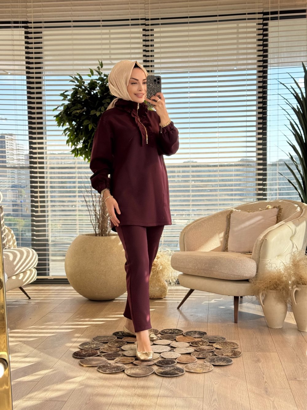 8567 Yaka Ve Patı Fırfırlı Takım Bordo