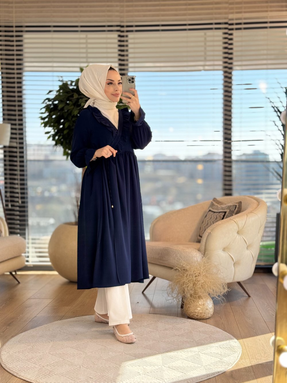 8593 Yandan Bağlamalı Yaka Kenarı Fırfırlı Elbise Lacivert