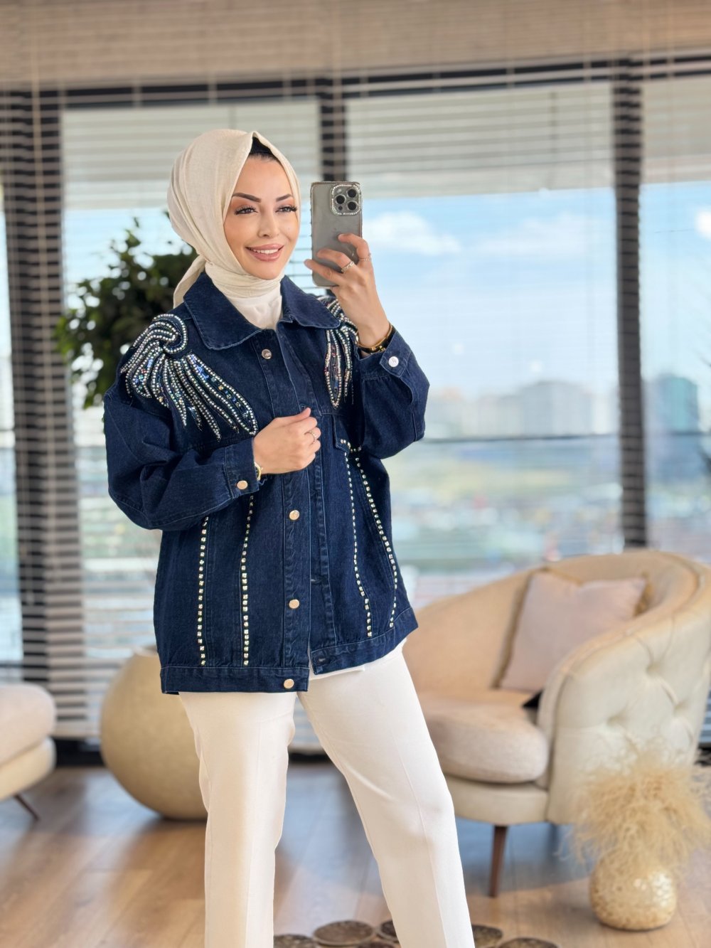 9191 Ön İnci Ve Taş İşlemeli Kot Ceket Lacivert