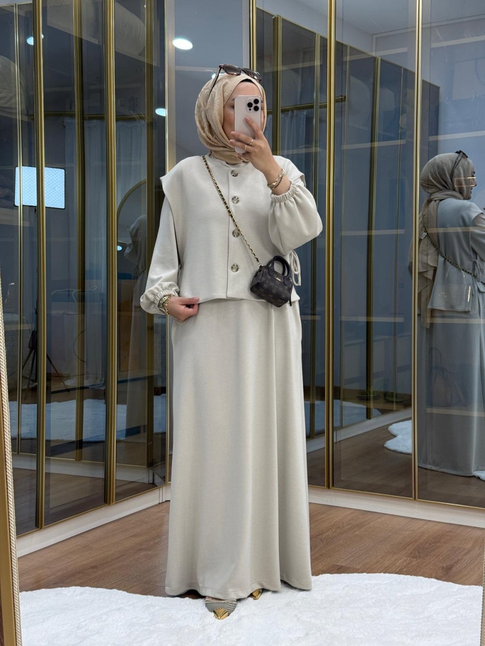 Asimetrik Düğme Detaylı Yelek Elbise Bej