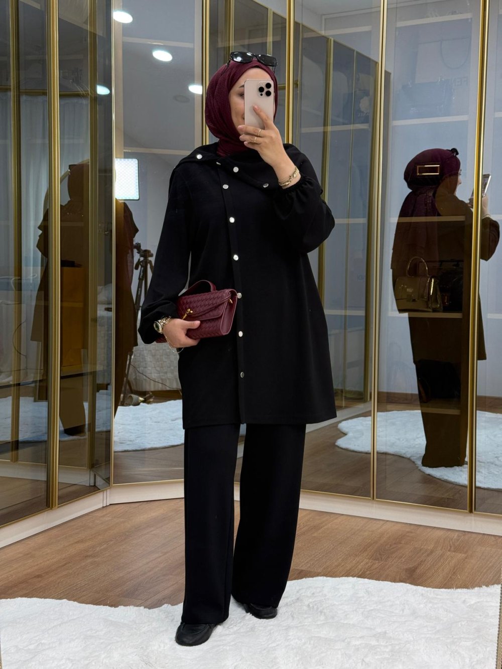 Asimetrik Metal Düğme Detaylı Takım Siyah