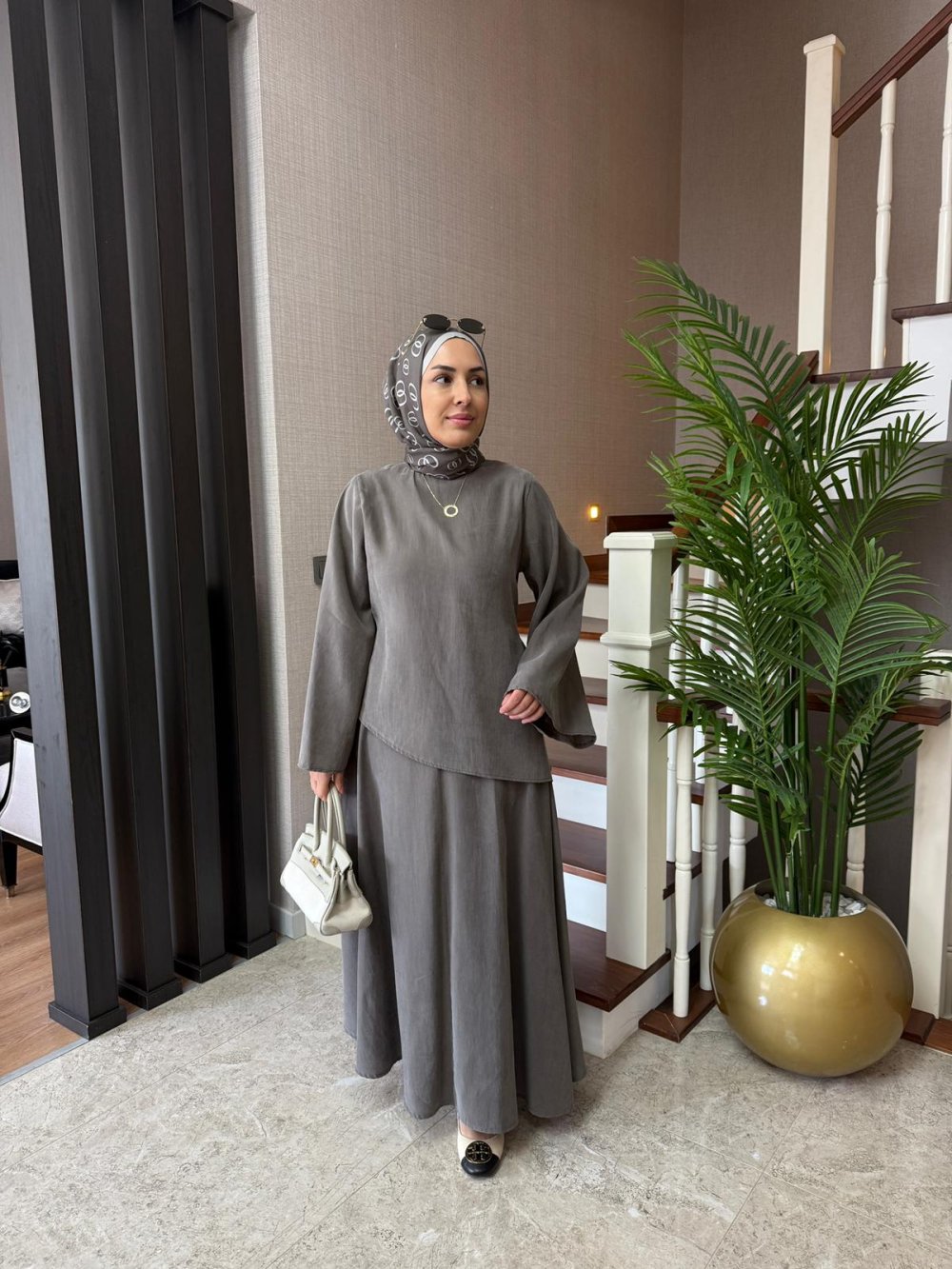 Etek boy 100 cm’dir. Yandan fermuarlı, önü kemerli ve arkadan lastiklidir.
