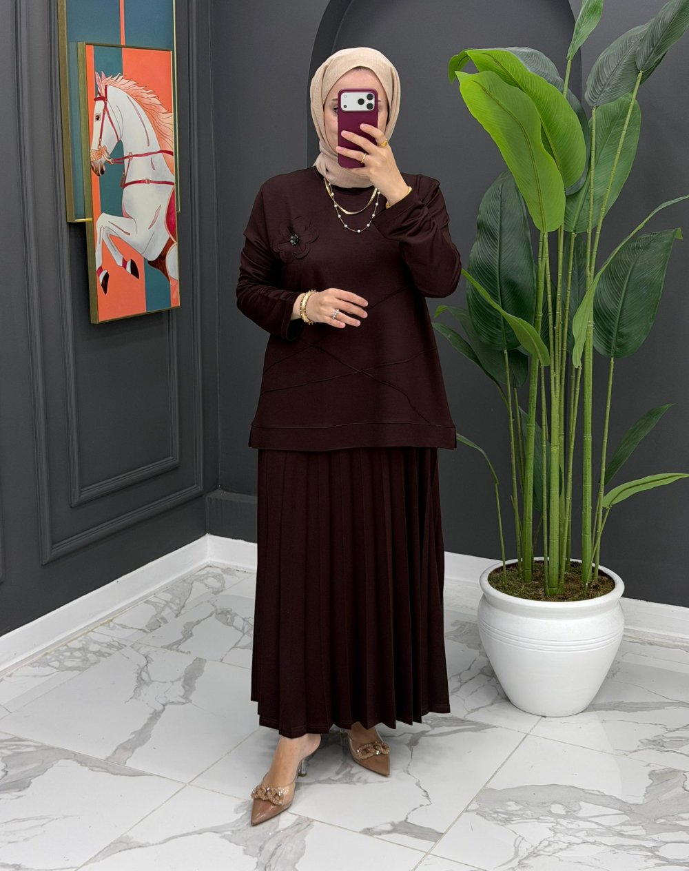 Çiçek Detaylı Etekli Takım - Kahve