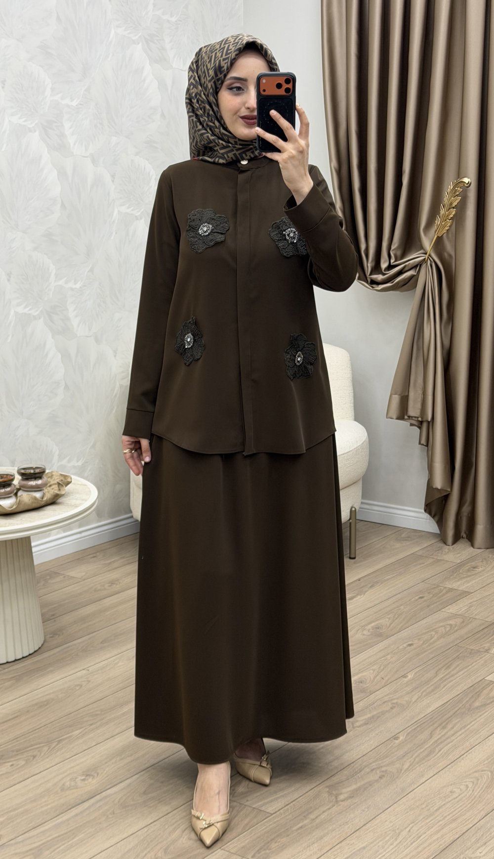 Çiçek Etek Takım Kahverengi