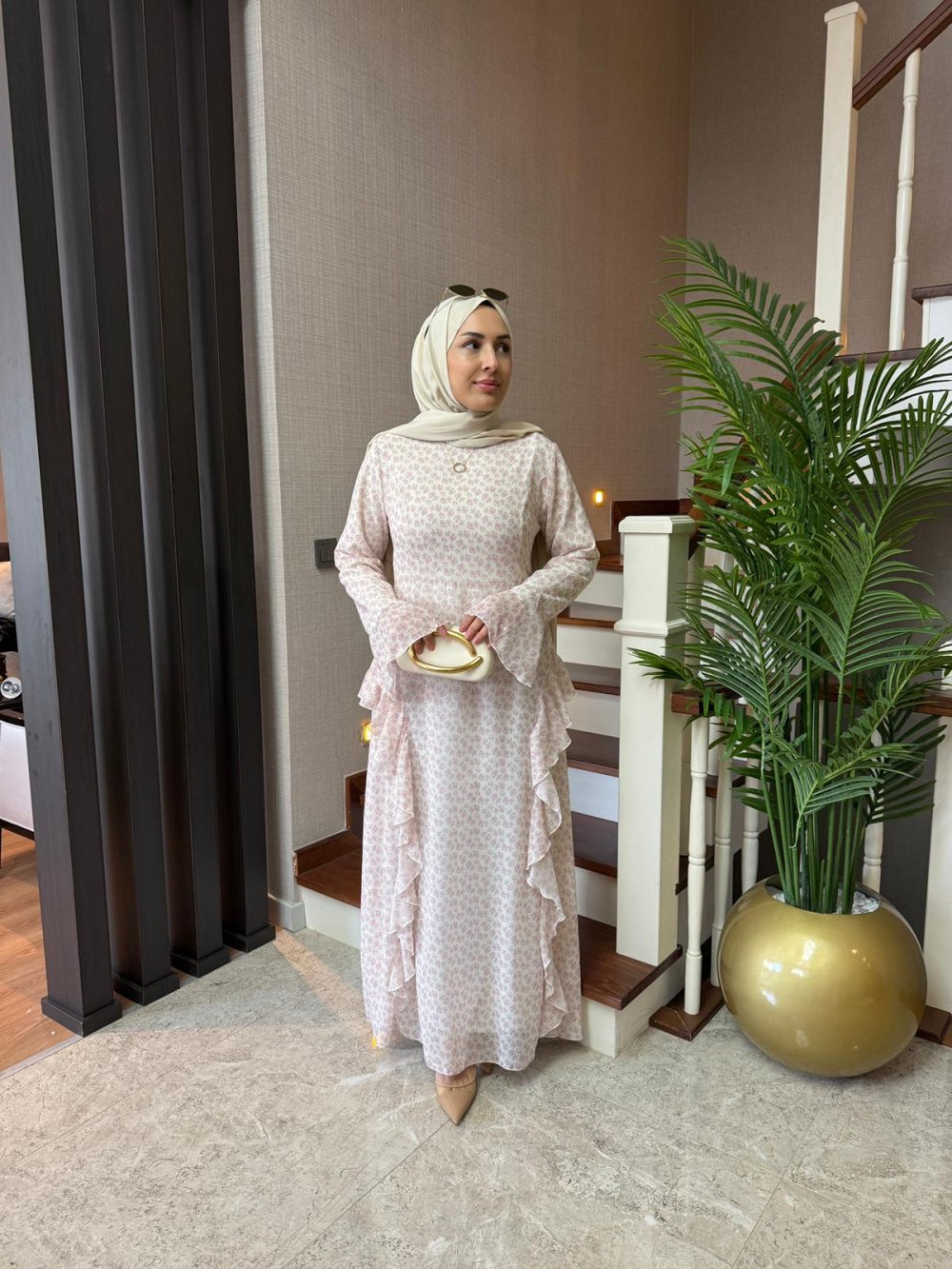 Boy uzunluğu 140 cm’dir. Yanlarında fırfır, arkasında büzgü detayı bulunmaktadır.