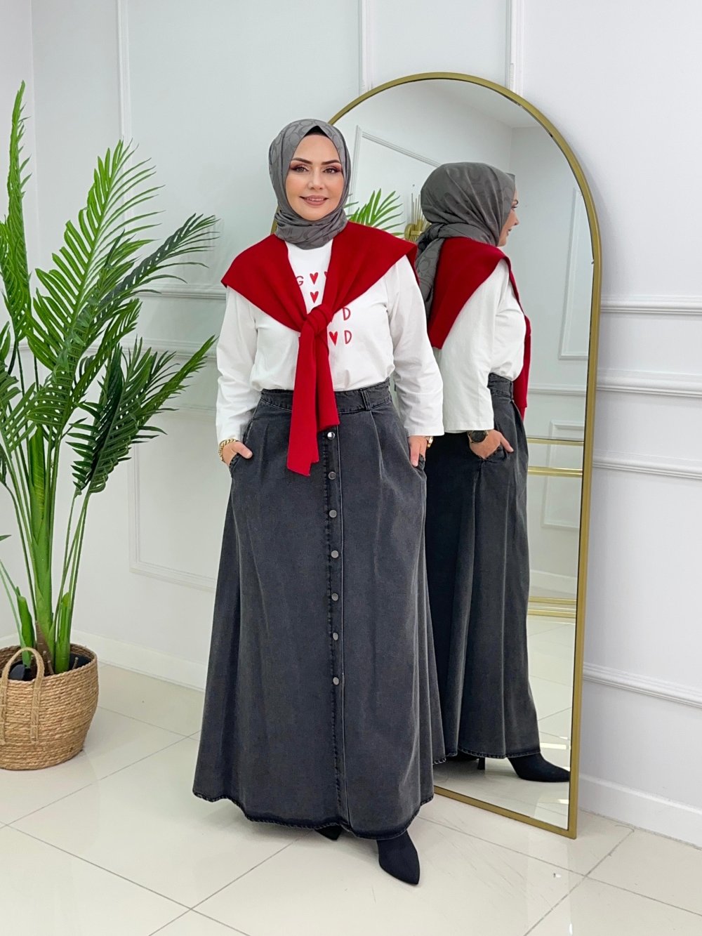 DÜĞMELİ DENİM ETEK - DUMAN